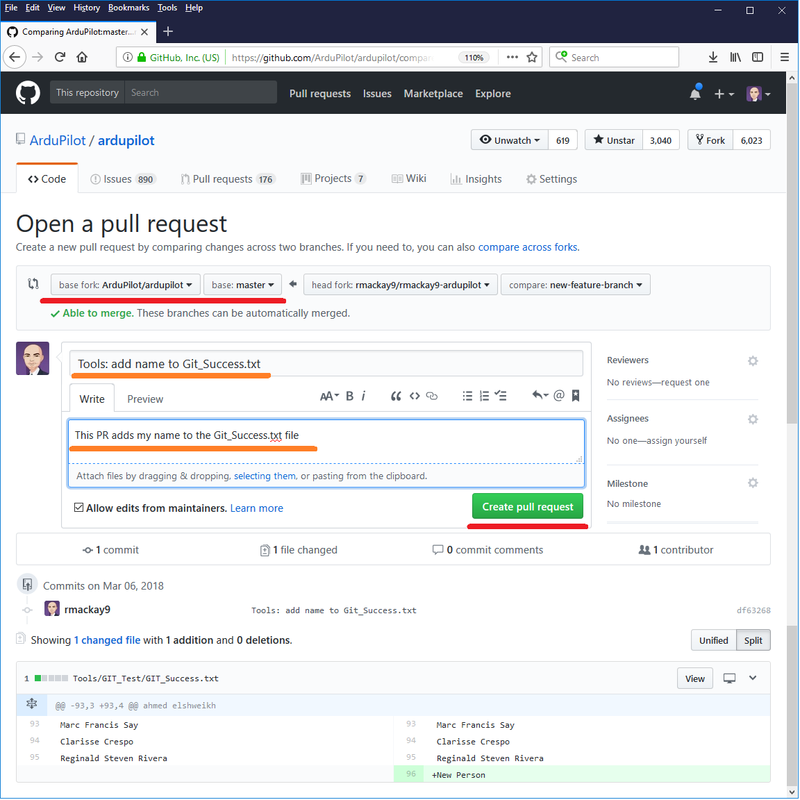 一旦您想在 ArduPilot 项目中加入错误修复或新功能,应提交一份 拉取请求.主开发人员会在 拉动列表、 如果一切顺利,它们将被合并到主文件中。