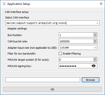 输入 "mavcan:udpout:support.ardupilot.org:",然后输入 CAN 接口的支持工程师端口号,并添加签名密钥。