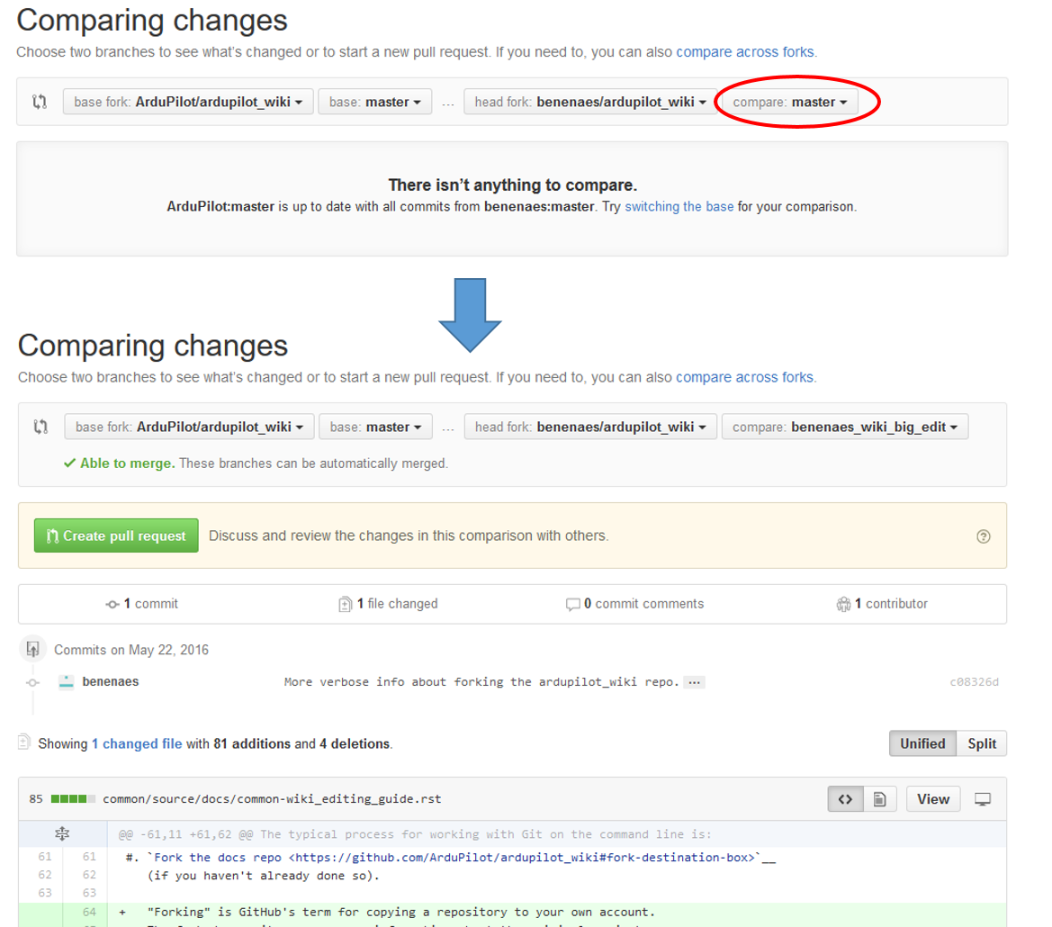 9. 比较对象应该是ardupilot_wiki:master和你创建的新分支。网站可能默认使用克隆的主分支,因此请单击 "比较 "组合框,将其更改为正确的分支: