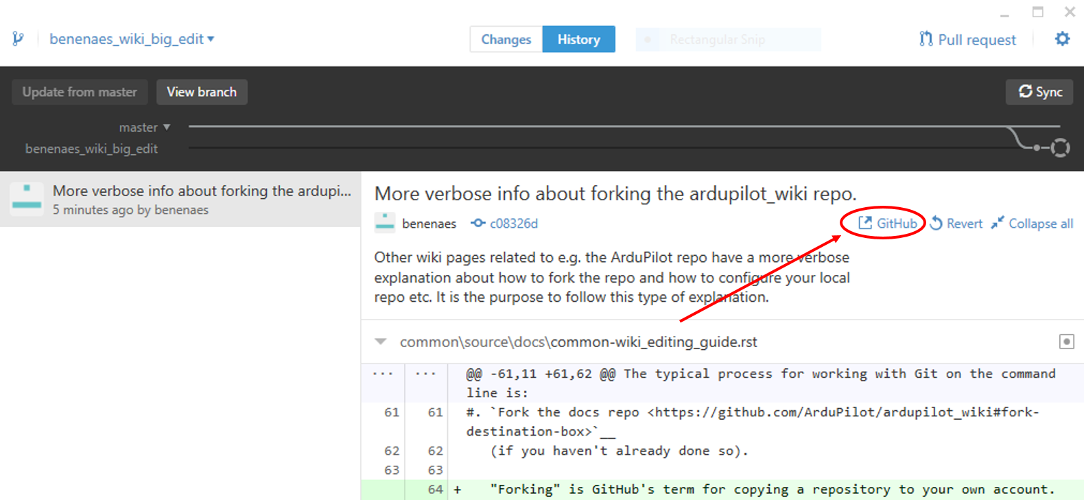 7. 在 GitHub 网页上打开克隆仓库,然后 在 GitHub 上创建拉取请求.您将从 GitHub 上的分叉/分支向 ardupilot_wiki/master 仓库提交拉取请求。如果使用的是 GitHub for Windows 客户端,导航到仓库/分支的一个便捷方法是单击其中一个提交,然后单击 "github"(在 github.com 上查看此提交)按钮: