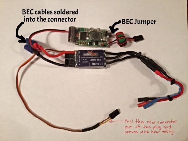 从电调接收器连接器上拔出中心(红色)针脚和导线。#.这将断开内置 BEC 与电调的连接。因为我们使用的是单独(专用)的 BEC,所以不需要它。#.将电调的 BEC 线用热缩管塞住。#.如果需要对电调重新编程,您将需要使用它。