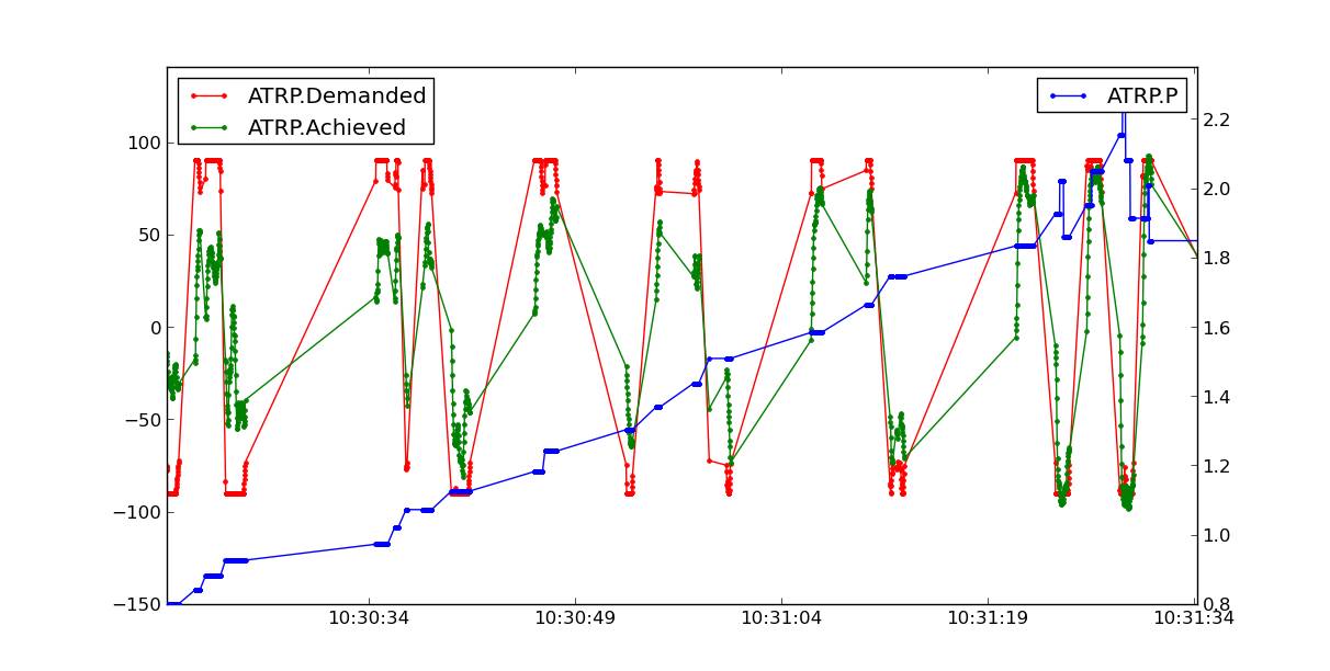 ATRP.Demanded 字段是要求的姿态变化率(滚转率或俯仰率),单位为每秒度数。ATRP.Achieved 字段是飞机实际达到的姿态变化率。如上图所示,在自动调整开始时,由于调整增益太低,需求值远远高于实现值。随着调整的进行,需求值和实现值开始趋同。上图中的蓝线是 ATRP.P 值,即控制器的 P 增益。您可以看到它从 0.8 上升到最高的 2.2,然后略微回落到 1.85 左右。