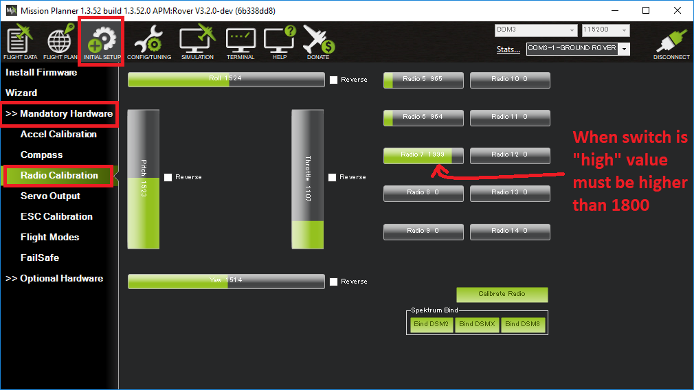 您可以使用Mission Planner地面站的初始设置 >>强制硬件 >>无线电校准屏幕,检查开关处于高位和低位时发射机发送的 PWM 值。如果它没有爬升到高于 1800 或低于 1200,最好调整发射机中的伺服端点。
