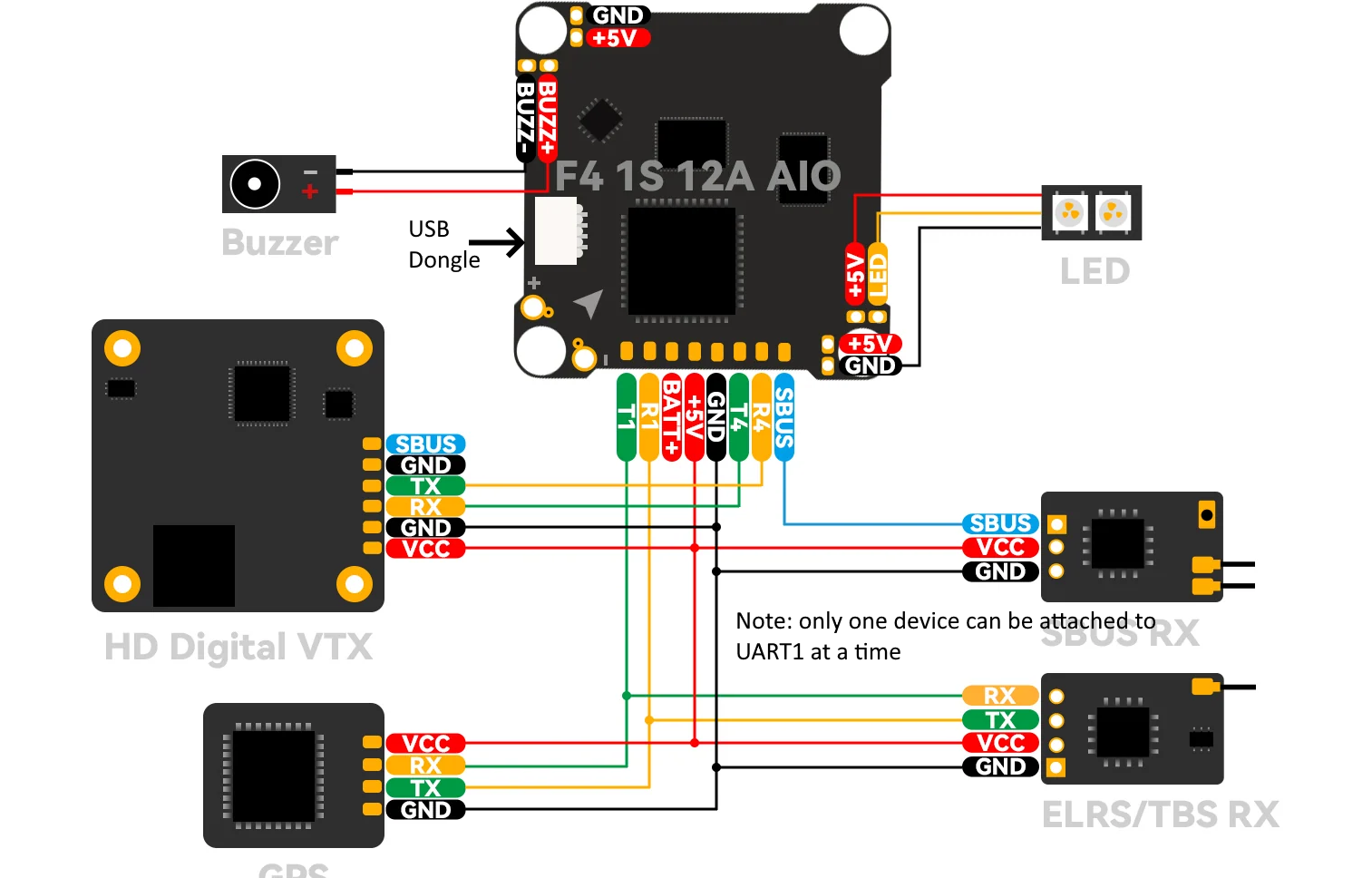 3 个 UART/串行接口,用于 GPS 和其他外设,第 4 个 UART 内部连接至 ELRS 板