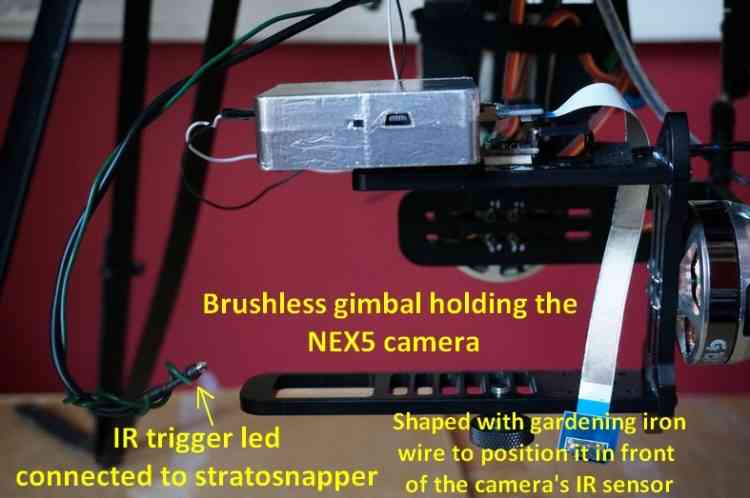 索尼 NEX5 由双轴稳定无刷云台固定(NEX5 未显示)。下面是红外 LED 定位和云台的放大图:
