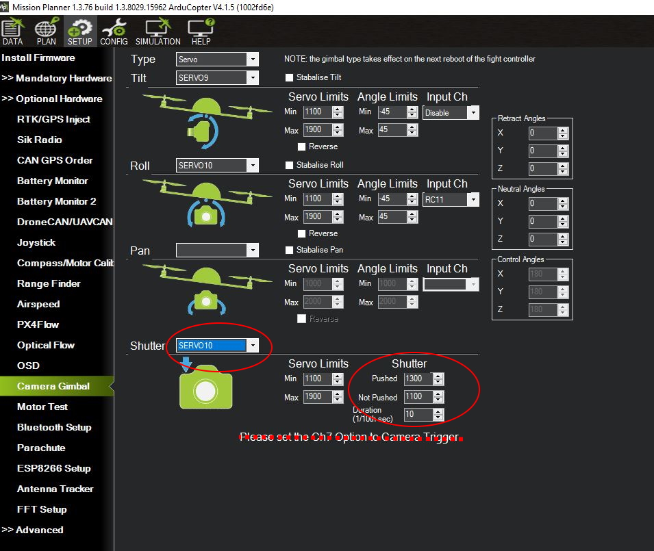 Mission Planner地面站:相机云台设置屏幕