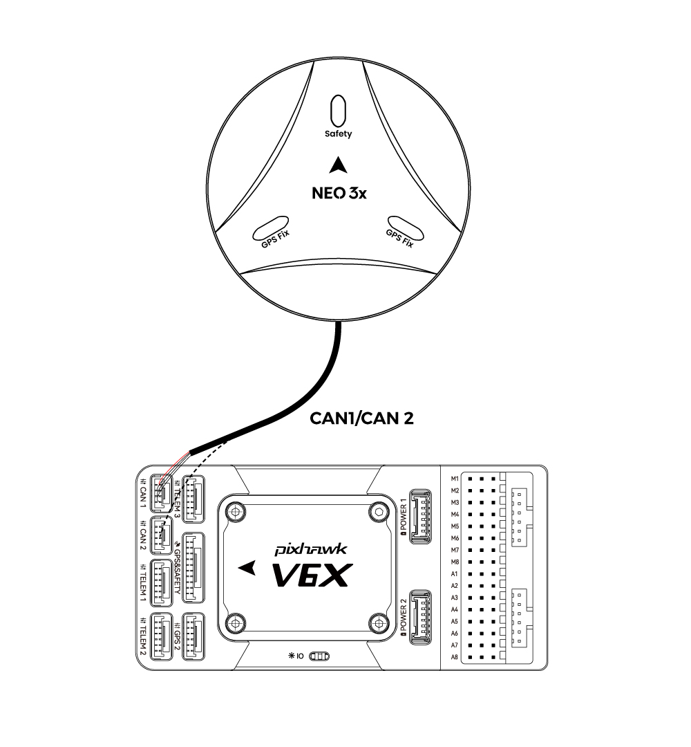 如图所示为 Pixhawk6X。与其他(飞行)控制器的连接类似。