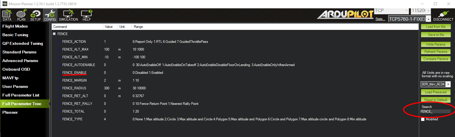 要启用栅栏,请转到Mission Planner地面站完整参数列表(CONFIG->完整参数树),搜索带有 栅栏_: