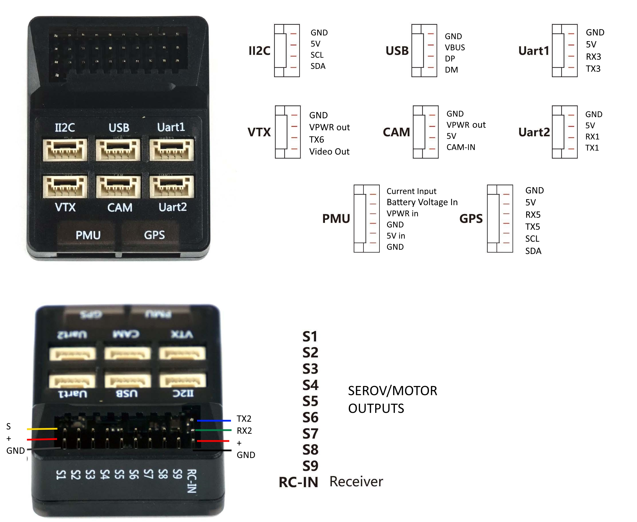 该电路板不包括 GPS 或指南针,因此需要一个 外置 GPS/指南针 要使自主模式发挥作用,就必须连接这些连接线。