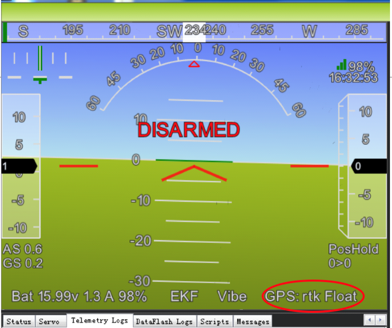 来自基站的 RTK 信息通过 MAVLink 信息发送给飞行器。在Mission Planner地面站的主 HUD 中,GPS 状态应显示 RTK Fix 或 RTK Float。