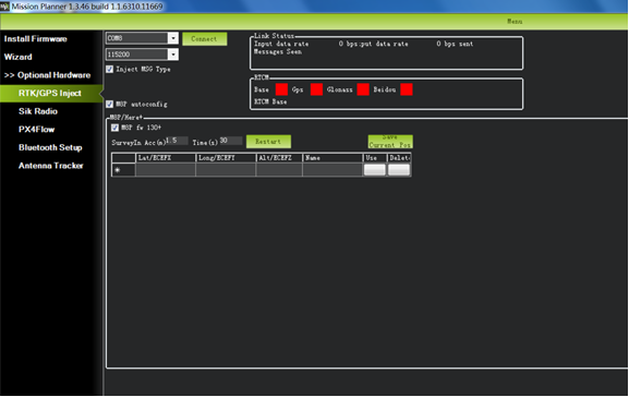 首先进行基站模块设置。在基站设置期间,漫游车和无人飞行器无需打开。打开计算机上的 Mission Planner 地面站软件,进入初始设置 ->可选硬件 ->RTK/GPS注入页面。您将看到以下页面: