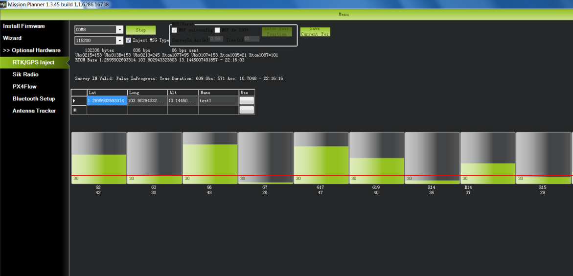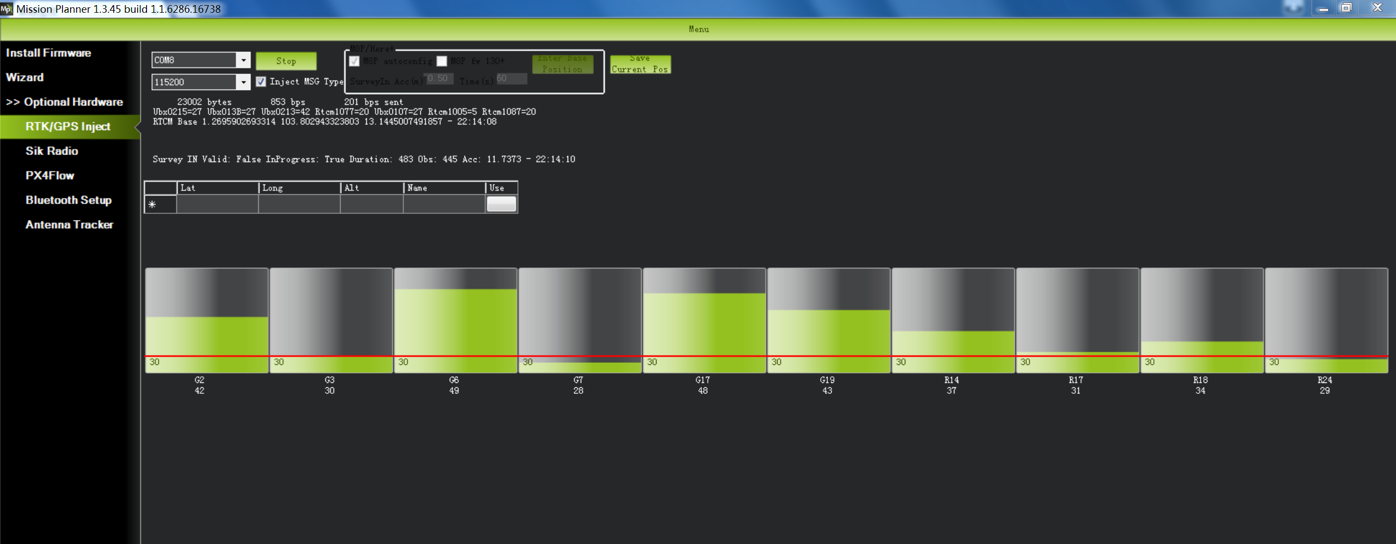 在勘测过程中,右侧方框将显示当前勘测状态:位置无效: 基站尚未到达有效位置;进行中: 勘测仍在进行中;持续时间:Duration:当前勘测任务已执行的秒数;Observation:已获取的观测数据数;Current Acc:当前基站可达到的绝对地理精度。Mission Planner地面站页面下部的绿色条显示正在探测的卫星以及与每颗卫星相关的信号强度。