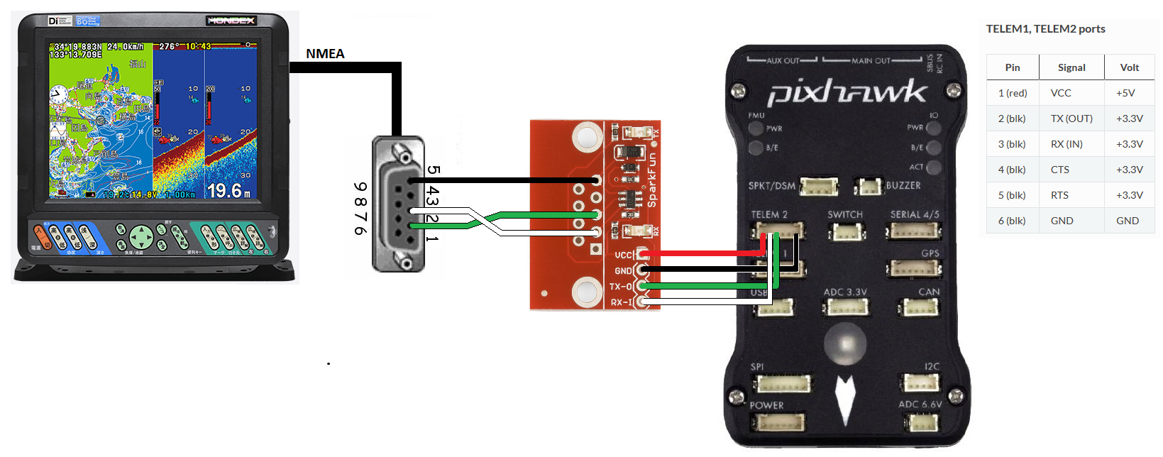 声纳的 DB9 接口与 RS232 转串口转换板的连接如下图所示。注意声纳 DB9 端口的引脚 2 和引脚 3 与转换板的引脚 3 和引脚 2 相连(即交叉)。转换板的串行输出可以连接到自动舵上任何可用的串行端口。下图中使用的是 SERIAL2。
