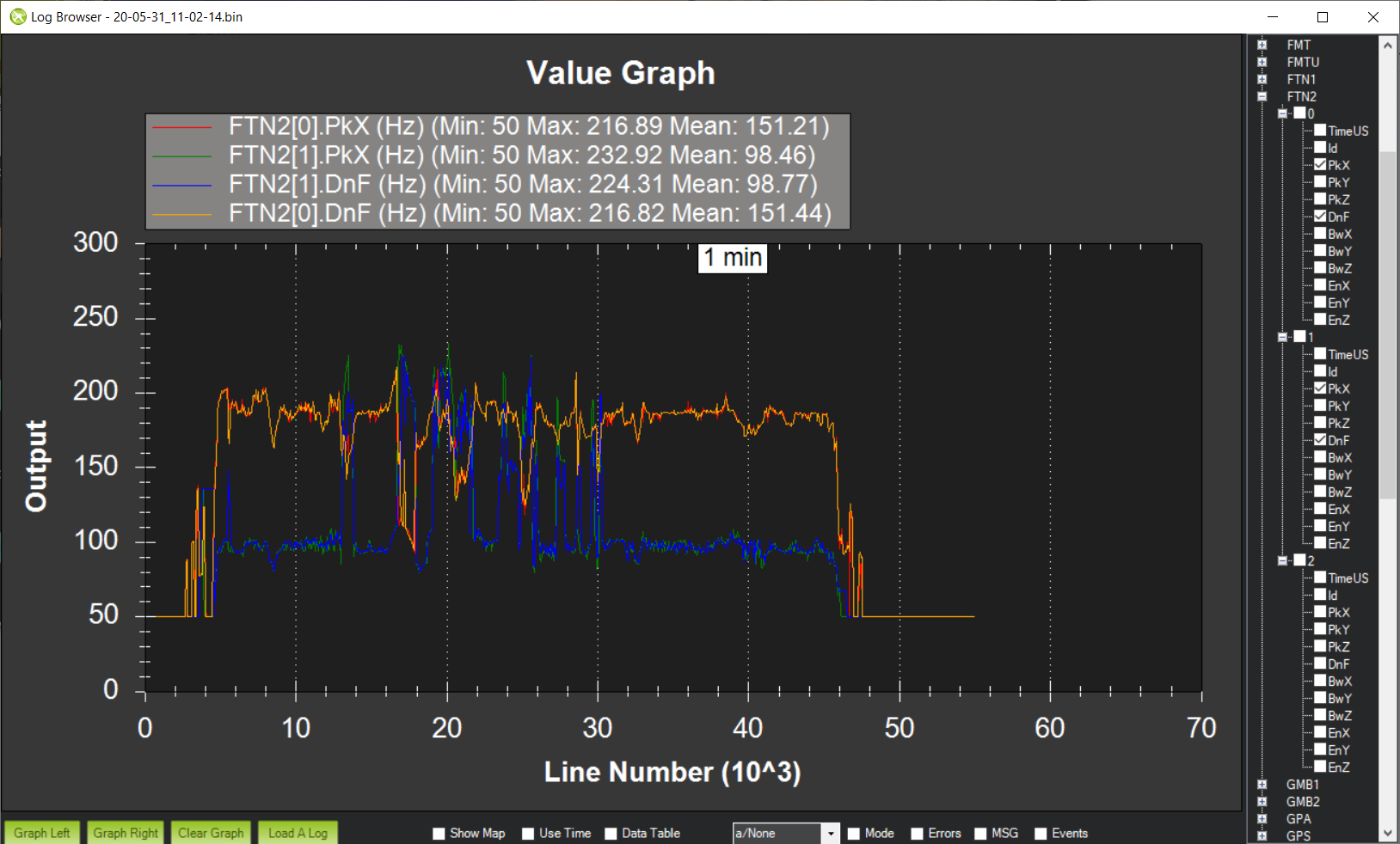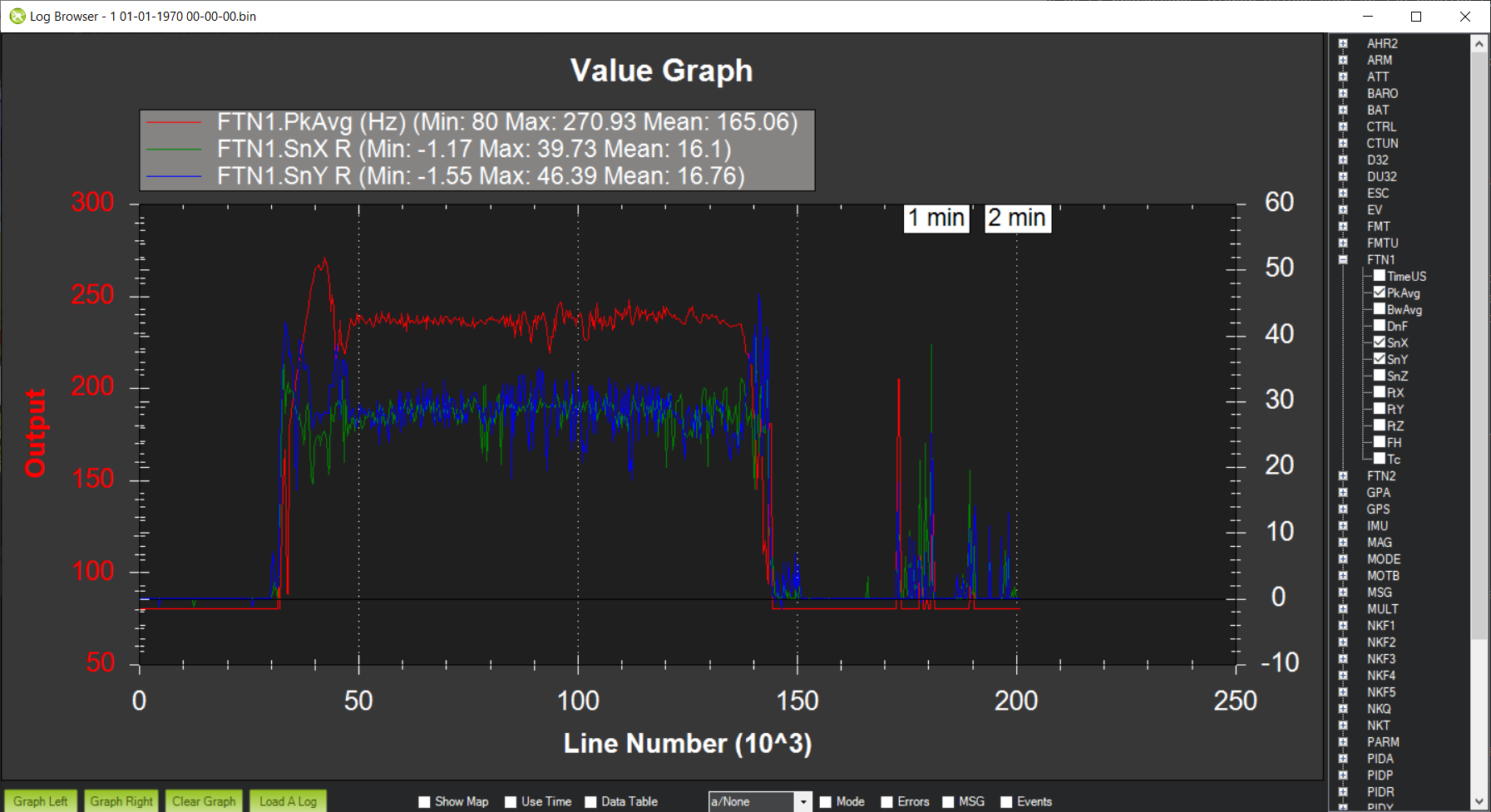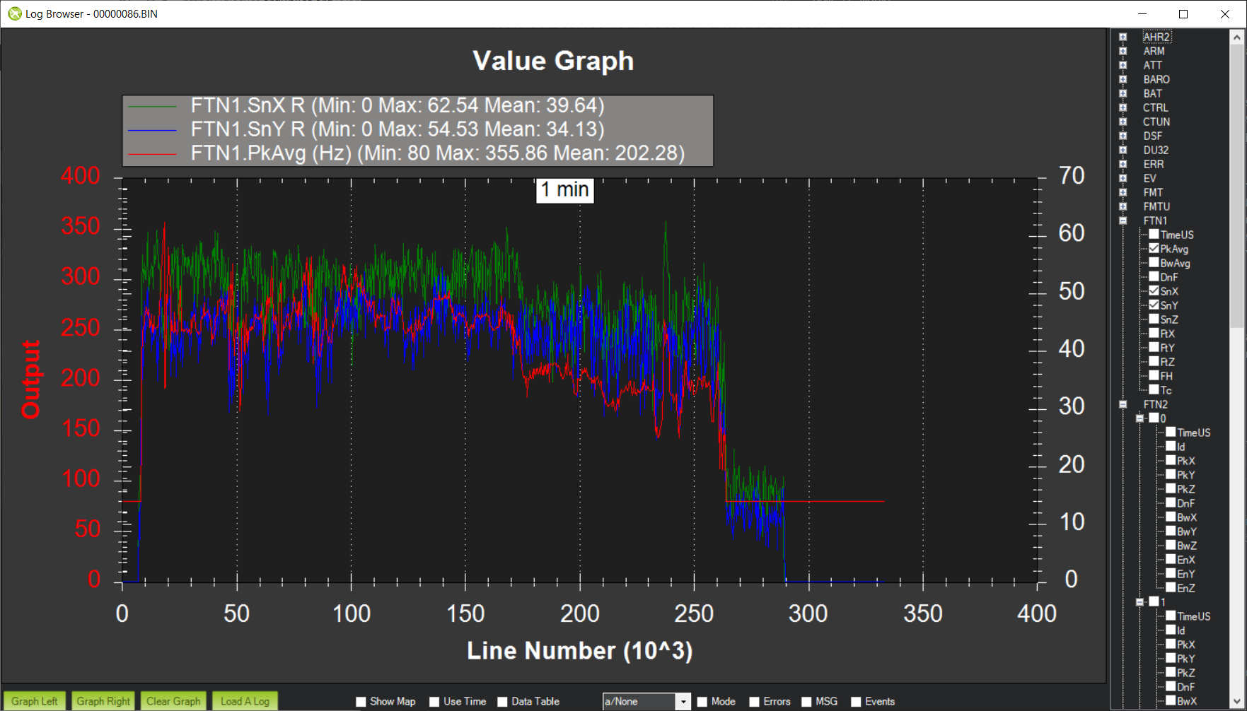 FTN1.SnX、FTN1.SnY 和 FTN1.SnZ 显示检测频率的信噪比。该值应高于 FFT_SNR_REF.中的飞行示例 初始飞行和飞行后分析 信噪比约为 58 分贝。