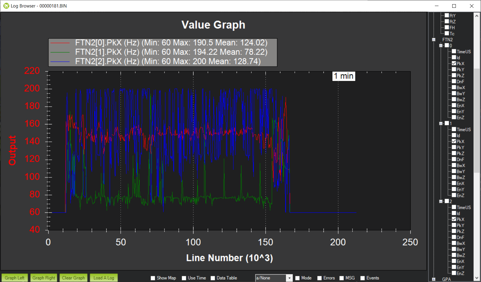 可以看出,滚动轴和俯仰轴对主频峰的跟踪非常紧密,而次要峰值基本上是跟踪噪声。遗憾的是,这种噪声有时看起来像能量最高的峰值,会扭曲主跟踪频率。如果出现这种情况,可以通过设置强制 FFT 引擎只跟踪主峰: