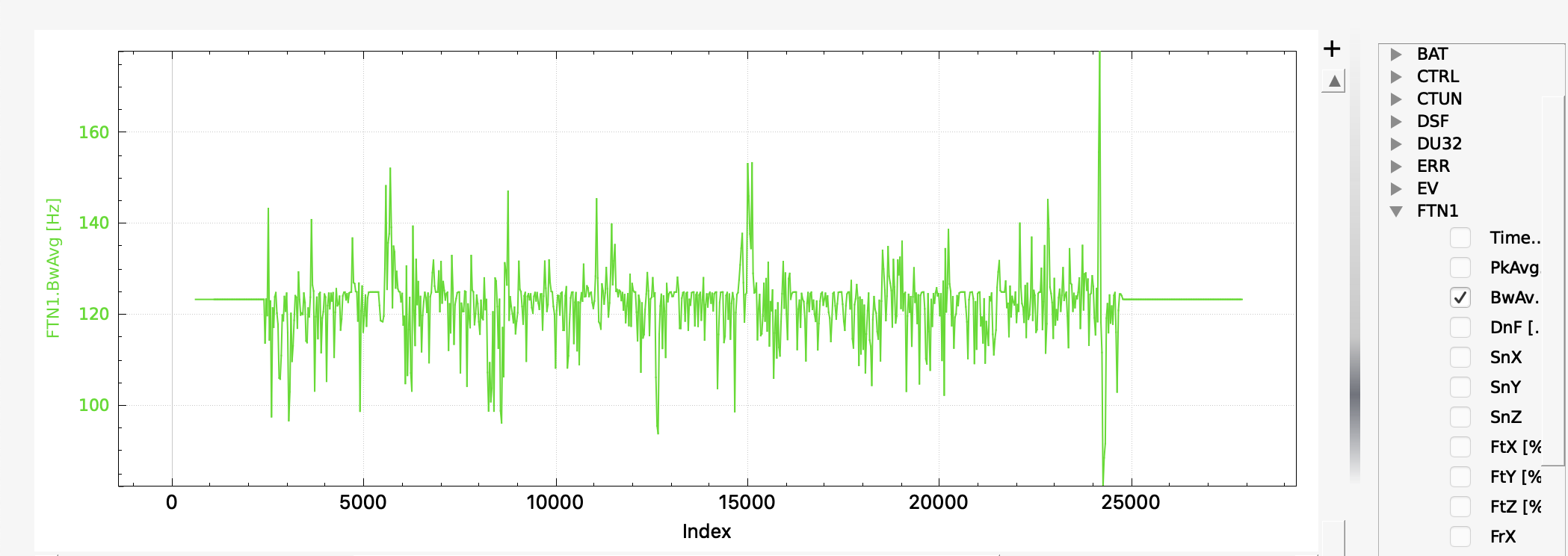 谐波带阻滤波的一个组成部分是带阻滤波的带宽,飞行中的 FFT 可用来确定带宽。下载稳定悬停时的日志并绘制 FTN1.BwAvg 图。这是 FFT 对噪声峰值带宽的能量加权估计值。下面是上述同一飞行的图表: