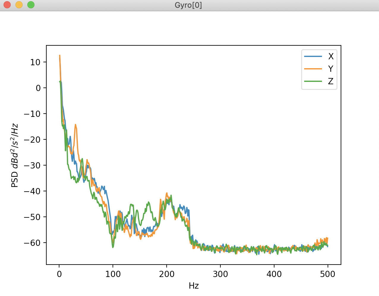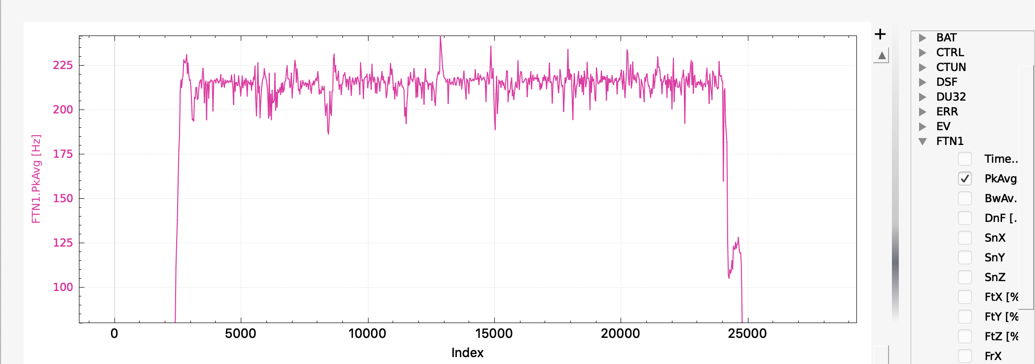 在图表上,应该可以看到与马达旋转频率相对应的噪声峰值。在较小的 Copter 上,这个峰值可能在 200Hz 左右,而在较大的 Copter/QuadPlane 上,这个峰值可能在 100Hz 左右。下面是一个在 Pixracer 上运行的 5 英寸四轴飞行器的示例。一旦飞行员加大油门,就会产生相当稳定的噪音,频率约为 220Hz: