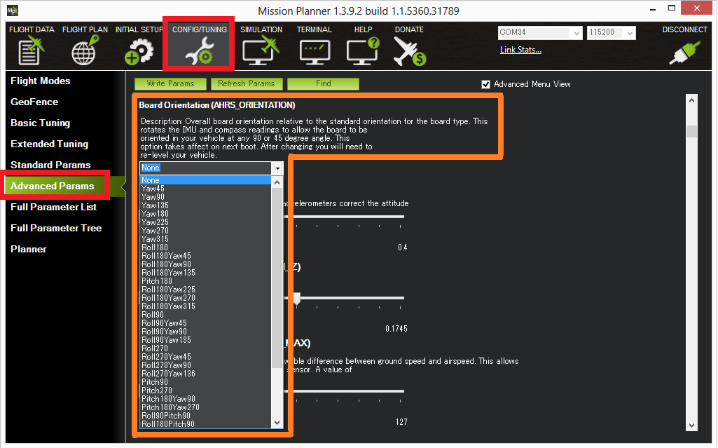 如果(飞行)控制器的标准方向不方便,还可以安装在其他 30 多个可能的方向上。可通过Mission Planner地面站查看和设置所有可能的方向列表
