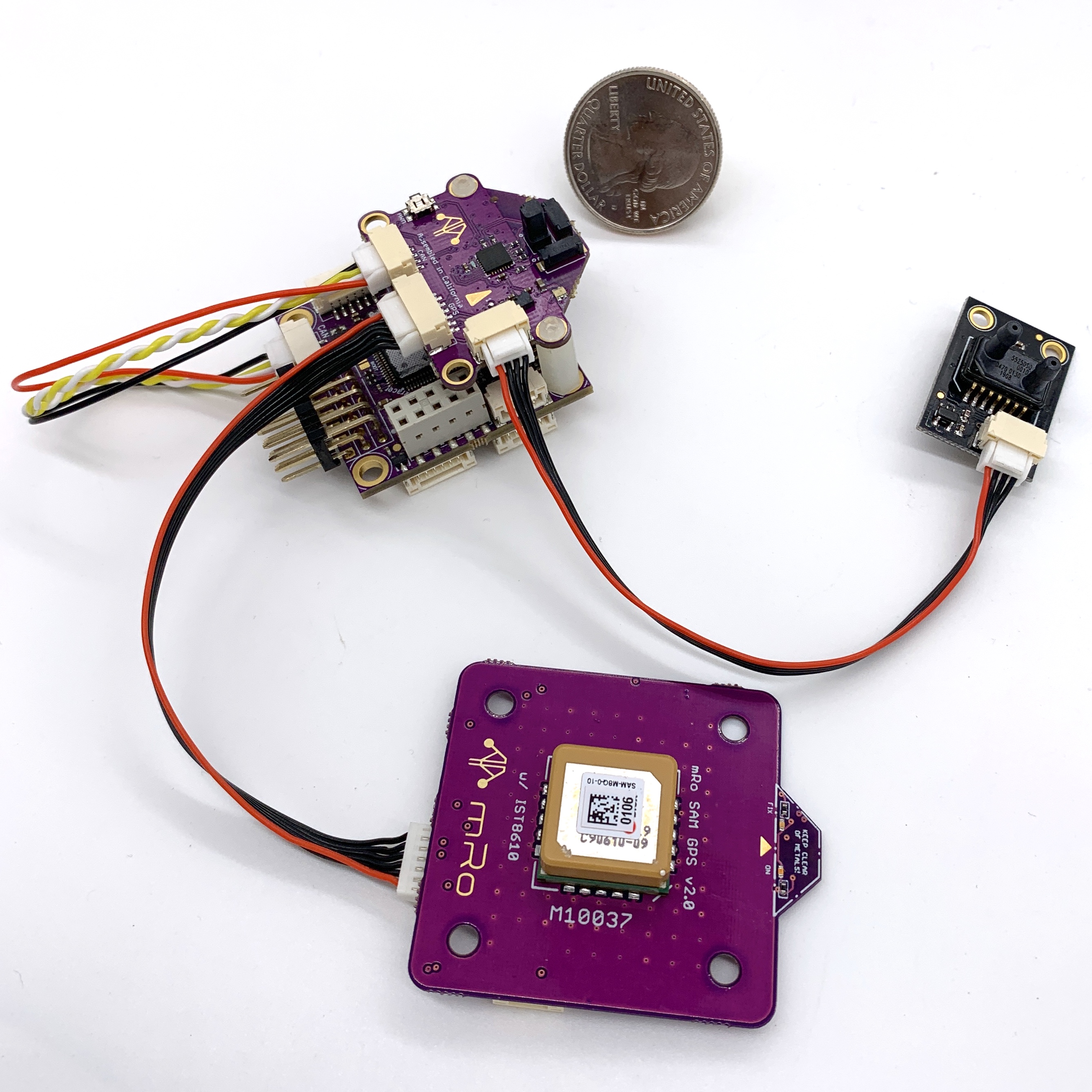 在这种情况下,Kitcan 连接到一个 mRo Pixracer (飞行)控制器,并为 MS5525 空速传感器和典型的 GPS/Compass 组合提供接口。 mRo SAM GPS + IST8308 Mag