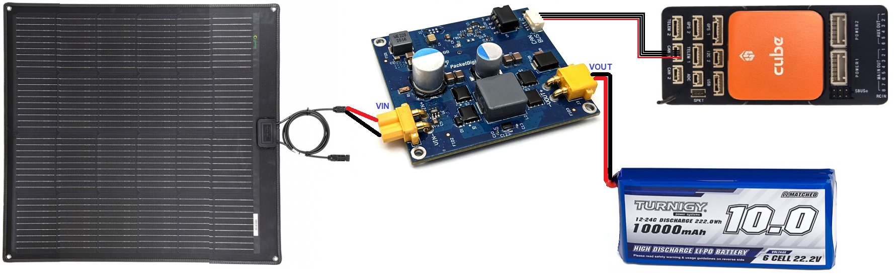 如上图所示,连接太阳能电池板、MPPT、蓄电池和(飞行)控制器。
