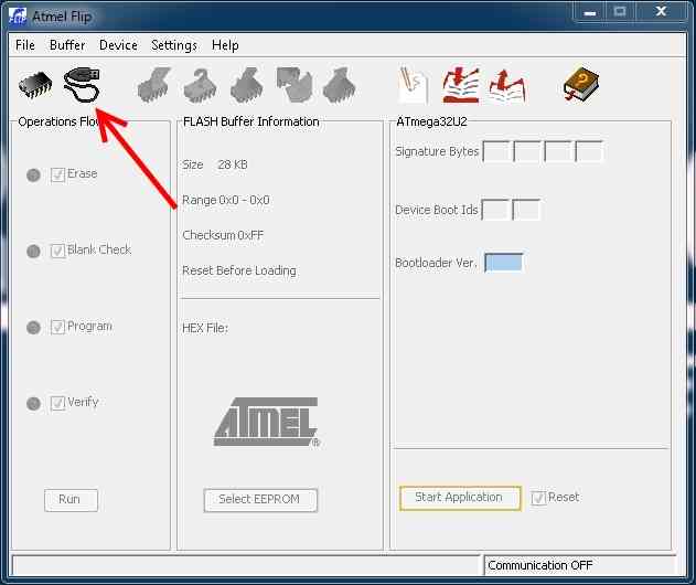 • 现在只需按下红色箭头所示的 "运行 "按钮,系统就会上传新固件。