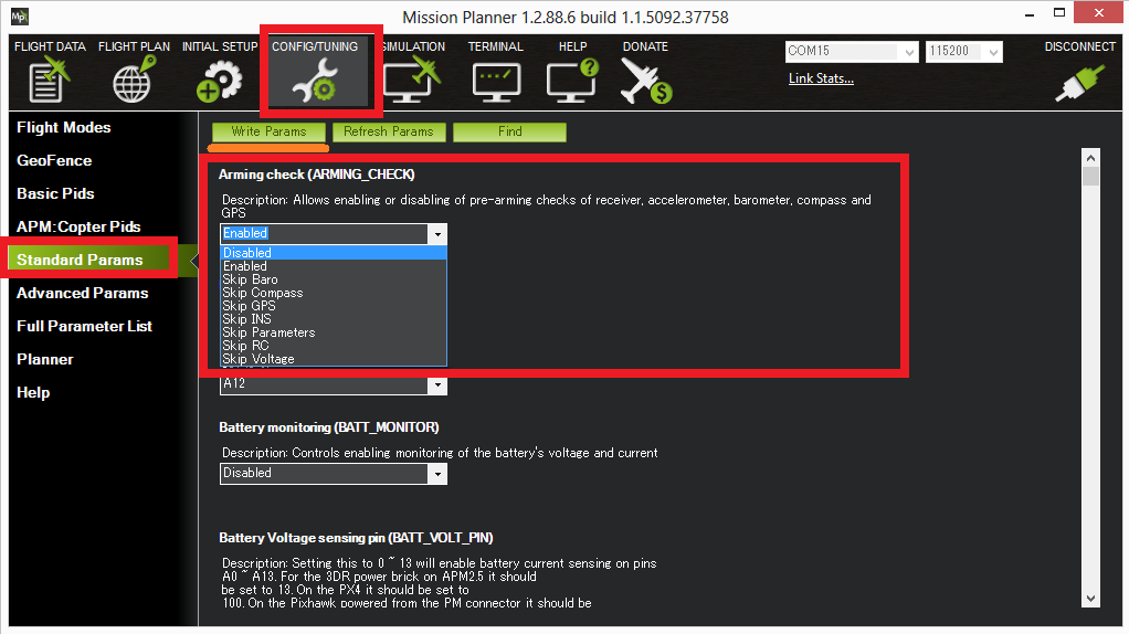 转到Mission Planner地面站的 "配置/调整>>标准参数 "屏幕