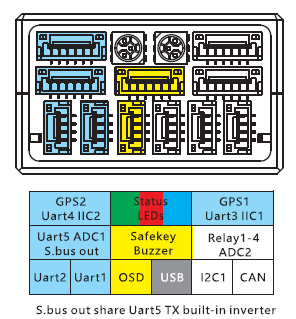 2 个 6.6V 容差 ADC 输入,用于 RSSI、模拟空速等。