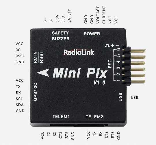 该硬件预装了 RadioLink 品牌版本的 ArduCopter 和兼容 ArduPilot 的引导加载程序。要使用基于 ChibiOS 的非品牌 ArduPilot 固件版本,请从以下网址下载所需的载具固件 .apj 文件 https://firmware.ardupilot.org/ 并使用 MissionPlanner 的 "自定义固件 "选项闪存电路板。