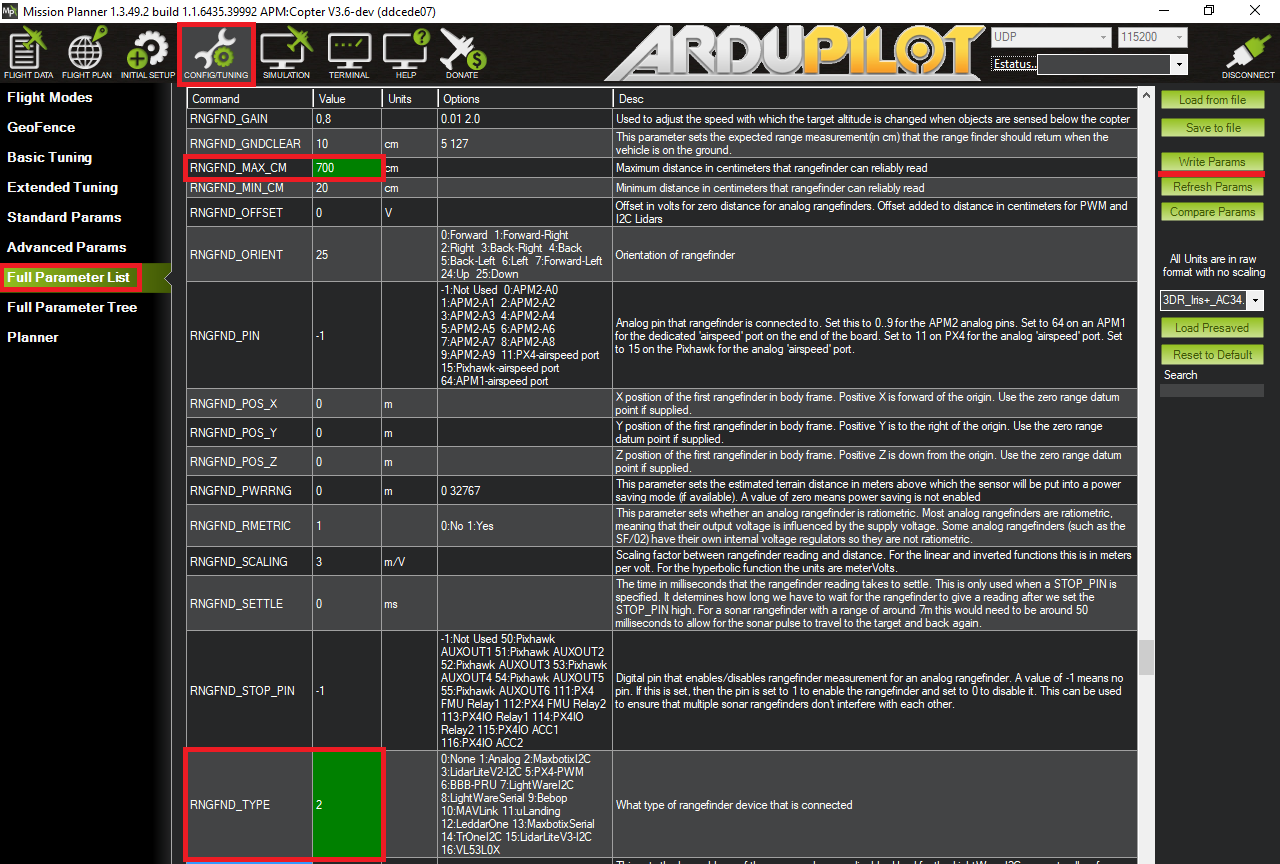 要配置 Copter、Plane 或 Rover 以使用 Maxbotix I2C,请首先连接Mission Planner地面站,然后打开 Config/Tuning >> Full Parameter List(配置/调整>>全参数列表)页面并设置以下参数(下面是第一个测距仪的示例):