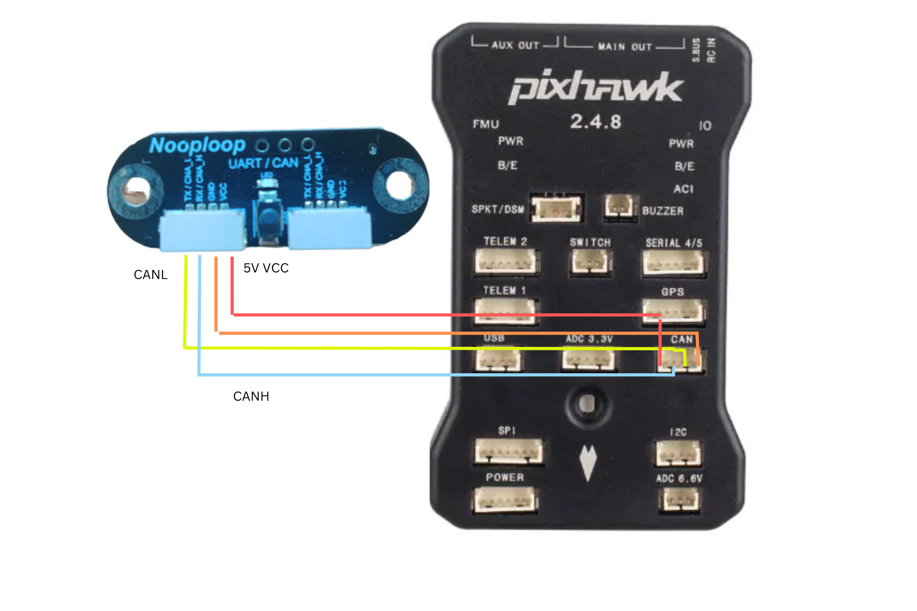 对于 CAN 连接,您可以使用任何备用 CAN 端口。由于这不是基于 DroneCAN 的传感器,因此您不能将所连接的端口用于任何其他类型的传感器。下图显示了如何连接 CAN2。