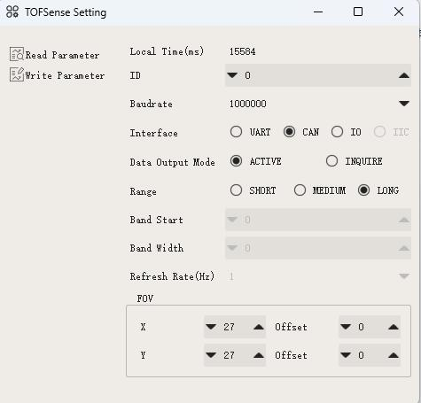 通过制造商提供的 NAssistant 软件设置传感器。更多详情请见 这里.对于 CAN 模式,在设置屏幕中将 "接口 "设为 CAN,模式设为 "活动",比特率设为 "1000000"。如果计划在一条 CAN 总线上使用多个 TOFSenseP,也可以将 "ID "设置为唯一的数字。将 ID 设置为 0 将接受所有 ID。