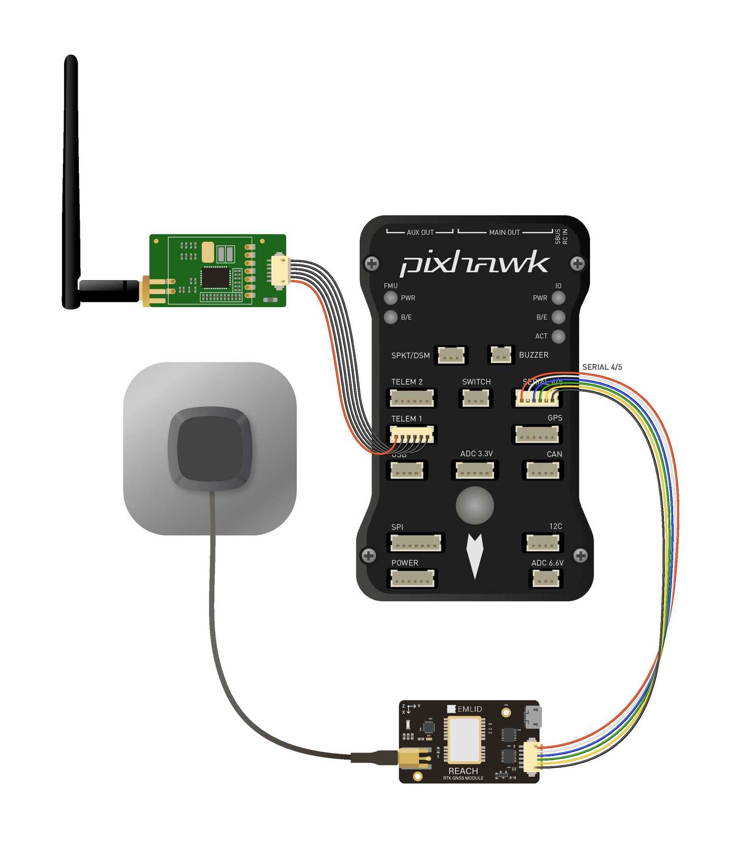 安装在飞行器上的 "Reach "装置可通过遥测无线电接收基准校正,因此不需要与无人机建立单独的校正链路。坐标输出通过串行端口实现。