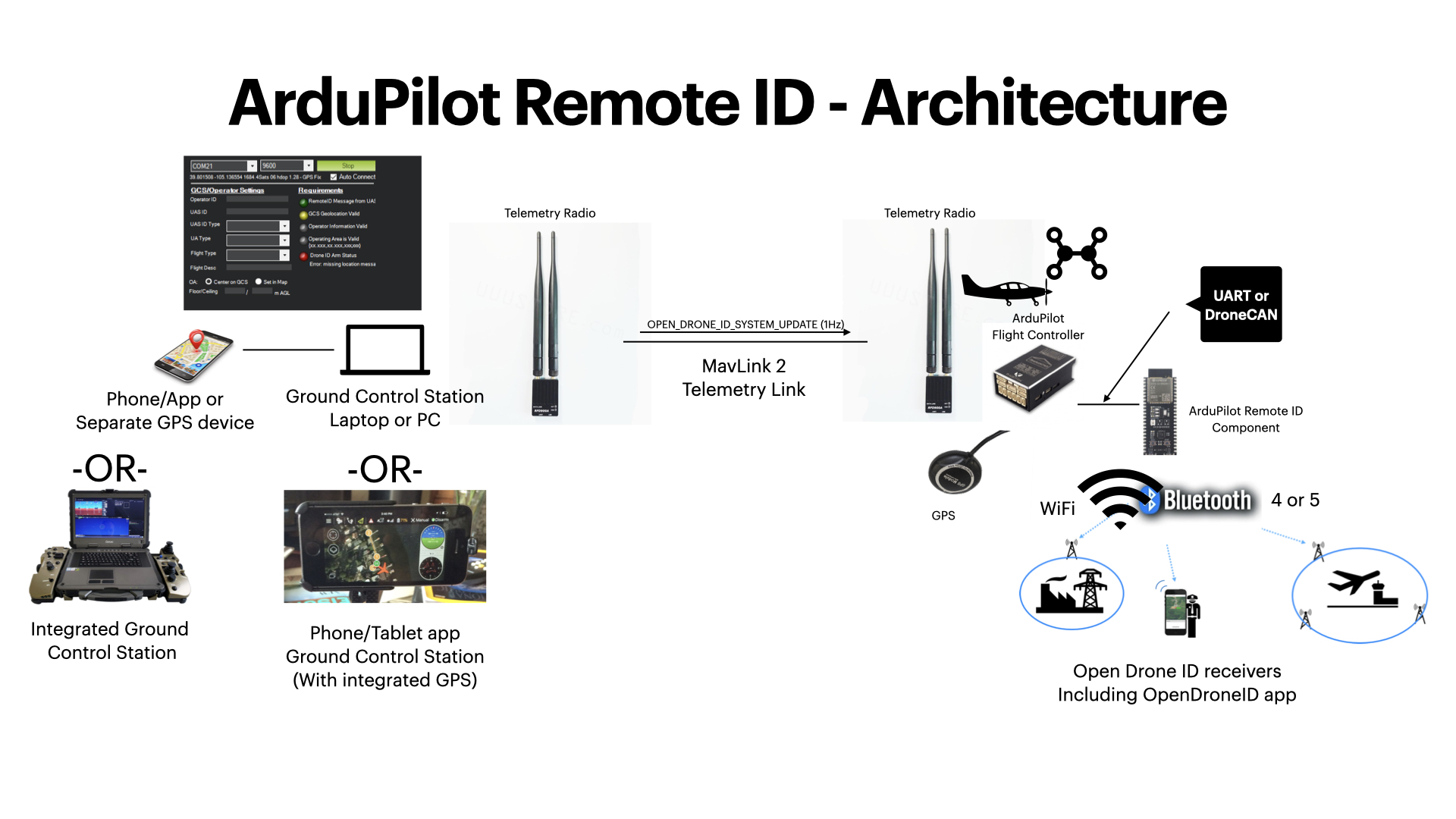 ArduPilot 在 4.2 及更高版本的固件中支持 OpenDroneID,可通过 MAVLink 连接到(飞行)控制器上的串行端口或 DroneCAN 端口上与 OpenDroneID 兼容的 RemoteID 模块。
