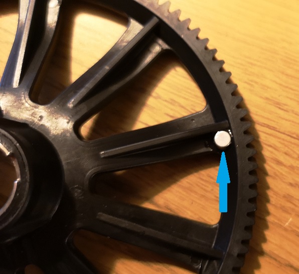 霍尔效应传感器可能是最常用的传感器,在足够强的磁场作用下,其输出电压会发生变化。磁铁需要固定在需要测量的旋转部件上。对于旋翼飞行器来说,这就需要在自动旋转尾翼驱动轮上开孔或凹槽,然后将磁铁粘贴到位(如下图所示)。对于 ICE,磁铁将安装在输出轴上。