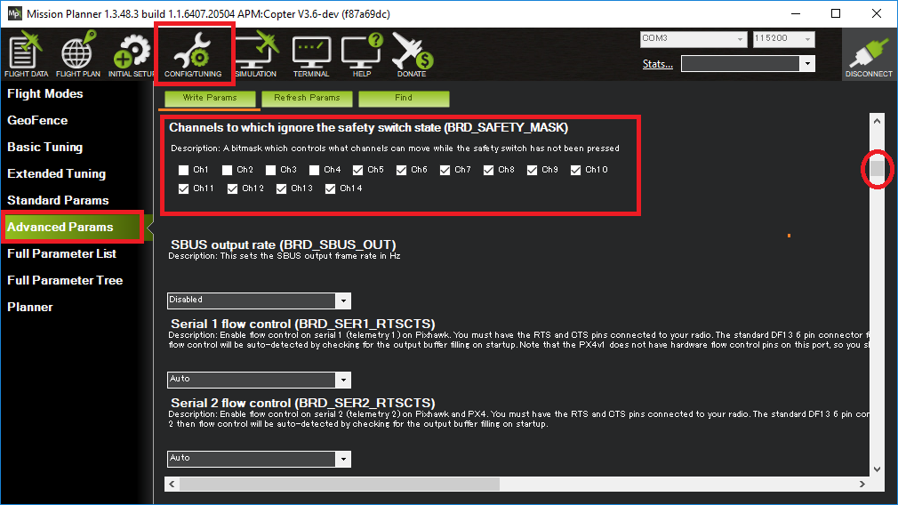 brd_safety_mask 可用于设置哪些单独通道通过安全开关保持启用状态。这允许在地面上进行有限的控制面移动,以检查操作是否正确。在所有稳定飞行模式下,电机输出都将保持禁用状态。