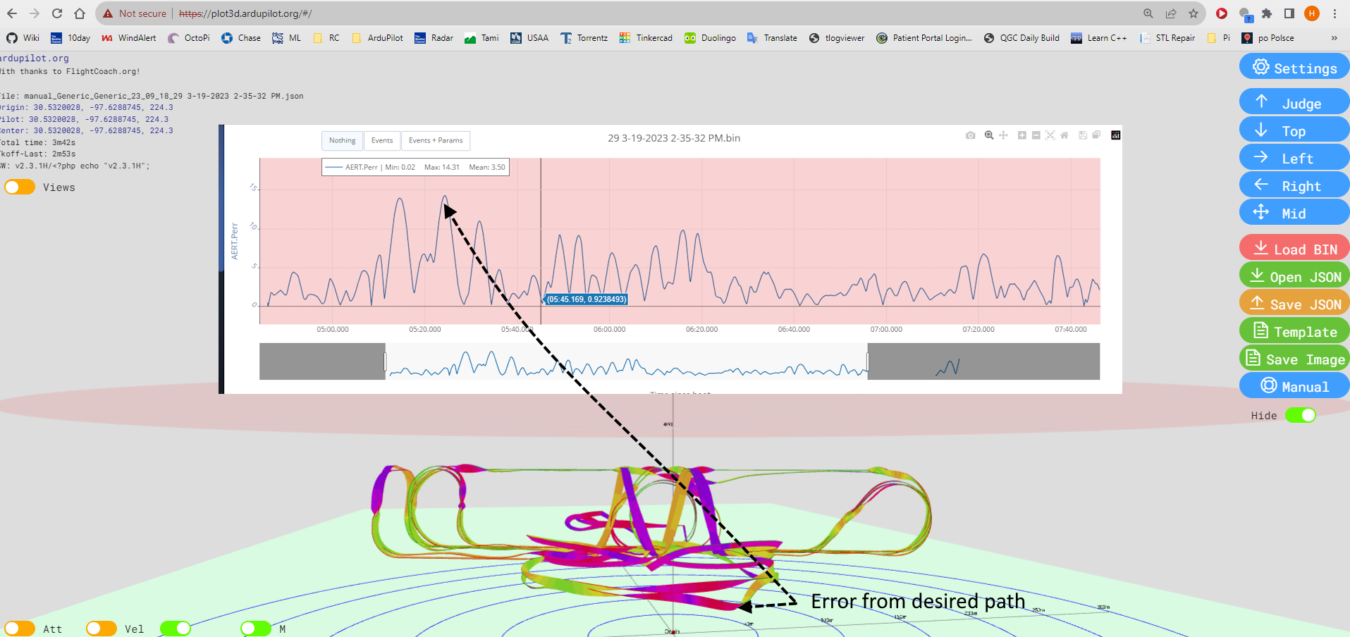 在上图中叠加的是第二个工具:使用 AERT.Perr 日志信息显示了与编程路径的 3D 位置误差,单位为米。从上面可以看出,飞行器在强逆风中一度被吹得顺风偏离滚动圆 15 米。在后来的飞行中,通过提高飞机进行例行飞行的速度(增加 空速巡航)