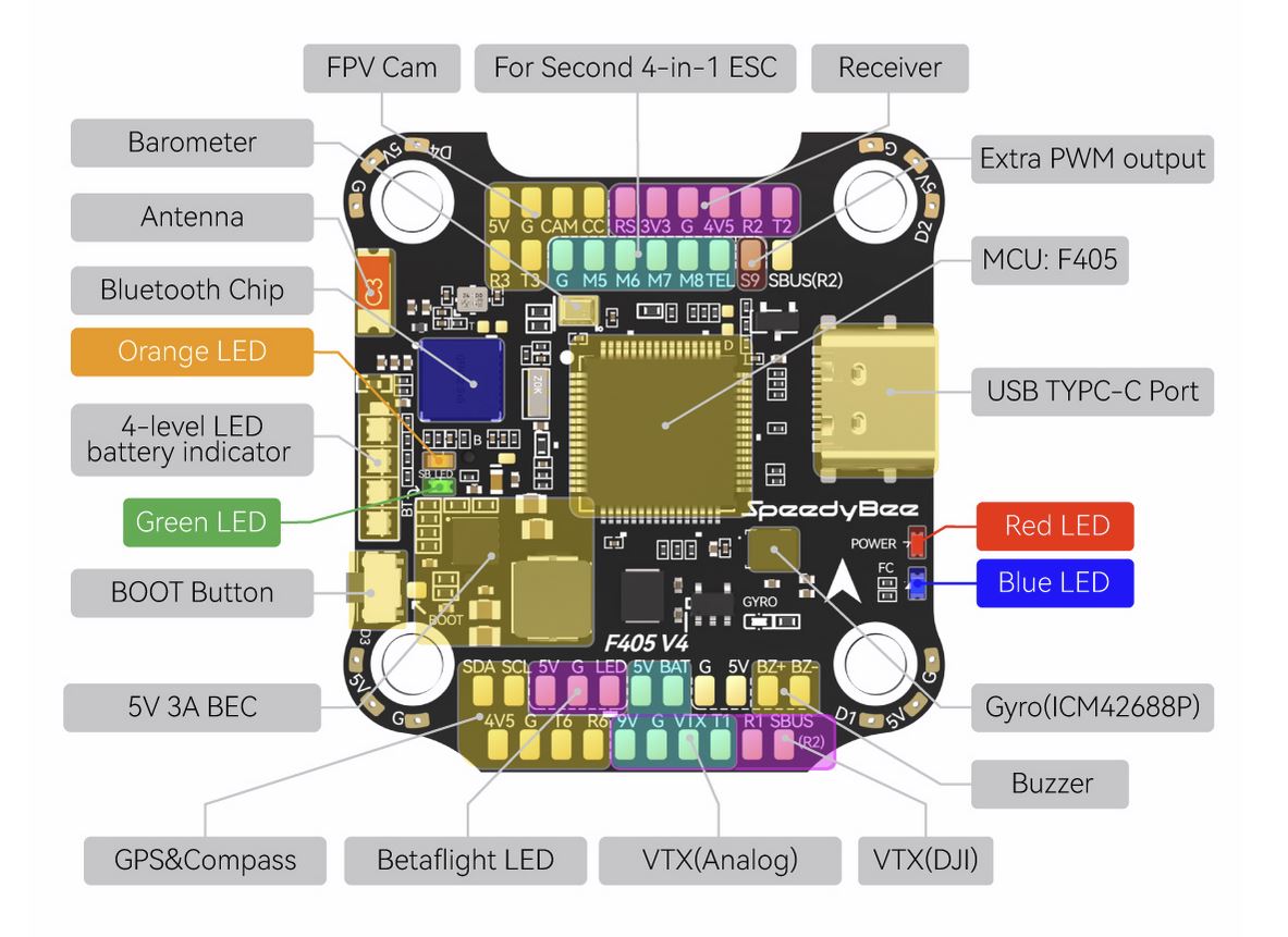 SpeedyBee F405 v3 没有内置指南针,但可以使用 SDA 和 SCL 焊盘上的 I2C 连接外部指南针。