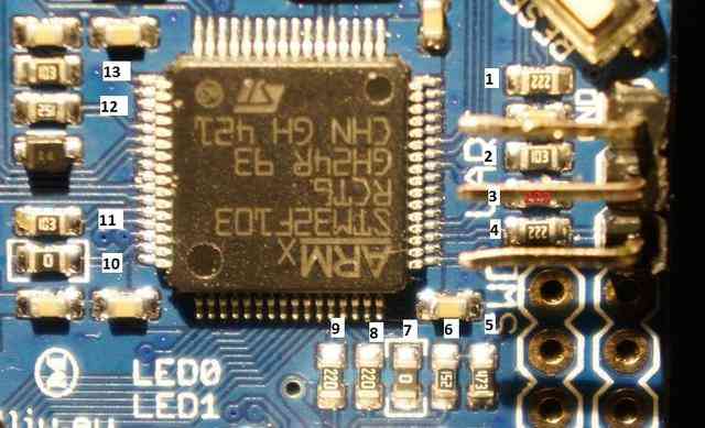 深入分析 在 rcgroups 上 结果发现,有些 STorM32 板需要将 4 号电阻器(如下图所示)短路(即在电阻器顶部焊接一根导线,将其变成普通导线),这样万向节控制器的信息才能传到 Pixhawk。