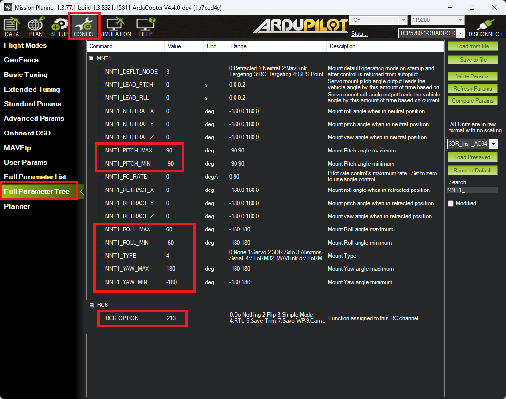 MNT1_TYPE = 4(SToRM32 MAVLink)并重新启动(飞行)控制器
