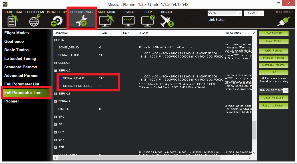 使用地面站(如 Mission Planner)设置以下参数。这些设置假定使用的是 Autopilot 的串口 2。如果使用的是其他串行端口,请将参数名称中的 "2 "替换为相应的串行端口号。