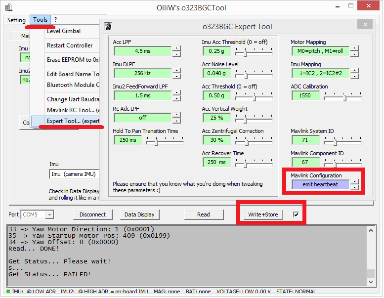 除了常规的万向节配置外 STorM32-BGC 维基百科因此,应通过 OlliW 的 o323BGCTool 的 工具 | 专家工具 屏幕,如下图所示。