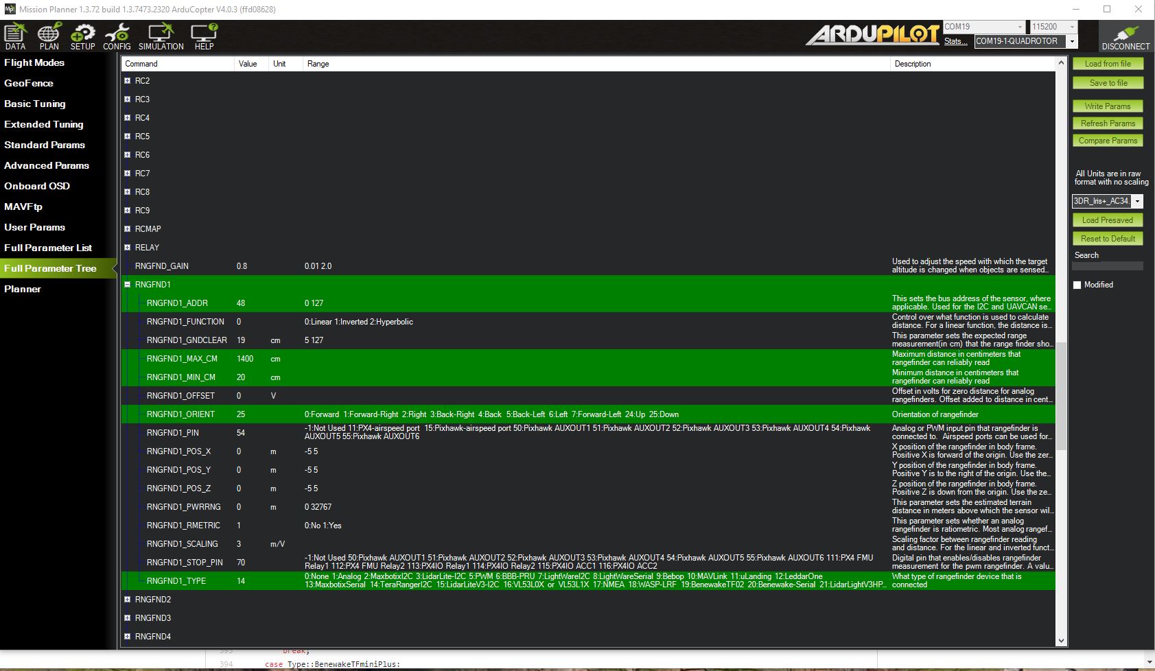 要将 TeraRanger EVO 传感器用作测距仪,请连接 Mission Planner地面站 并打开 参数配置/完整参数列表 菜单并设置: