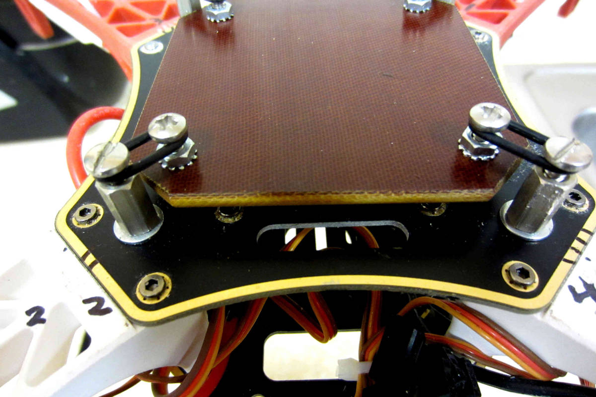 创建一个平台,在四个角上打孔或拧螺丝,将(飞行)控制器安装在上面。用双面泡沫胶带将(飞行)控制器安装在这块板上。