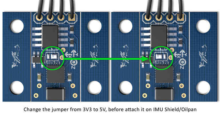 购买 HMC5883L 磁强计霹雳板.确保 3DR 板设置为使用 3.3 伏(APM 2.5 的 I2C 端口使用 3.3 伏,而不是 5 伏)。您必须修改 3DR 电路板,因为 3DR 出厂时设置的是 5 伏跳线,如下图所示。
