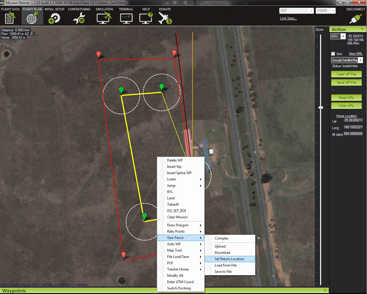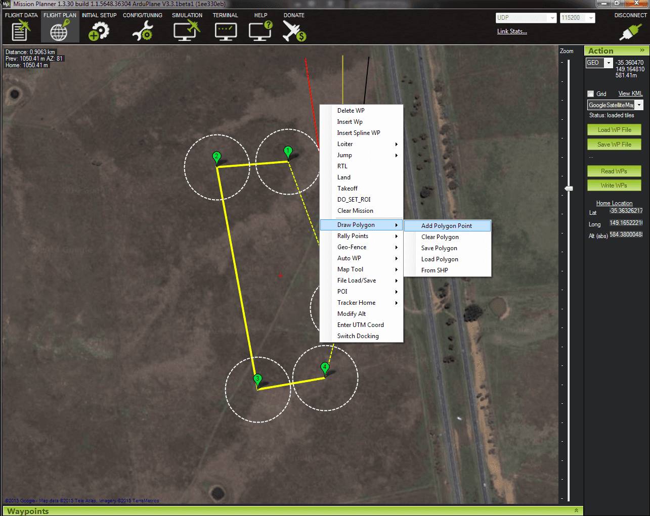 Mission Planner地面站也遵循非常相似的流程。首先右键单击要开始地理围栏边界的位置。