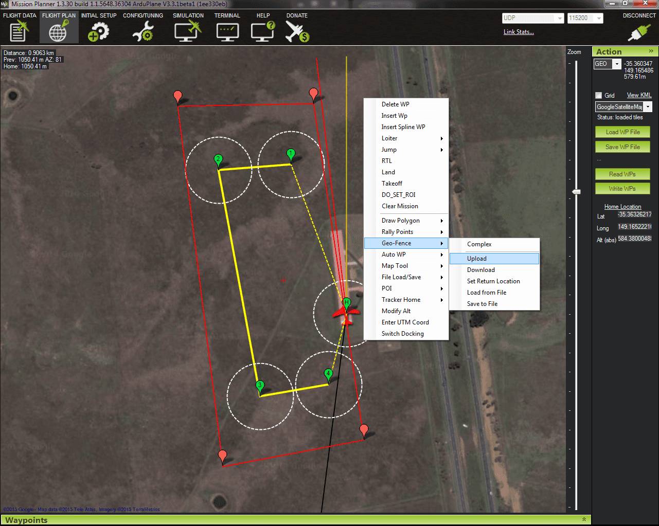 然后,您可以右键单击并选择上传地理围栏,将围栏边界发送到 APM。在上传之前,规划器会询问您围栏的最低和最高高度(以米为单位)。您还可以将围栏保存到文件中,以便日后加载。