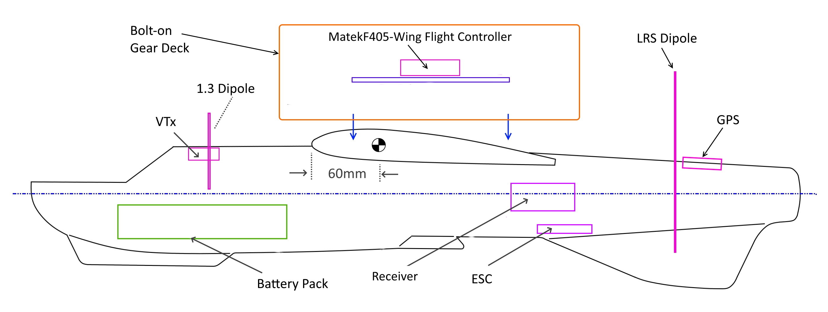 FPV 摄像机和发射器的选择很多,而且每天都在增加。请确保相机和视频发射器都能在 9V 电压下工作,因为 MatekF405-Wing (飞行)控制器为视频供电。也可通过(飞行)控制器背面的焊接跳线将视频电源从 9V 改为 12V。
