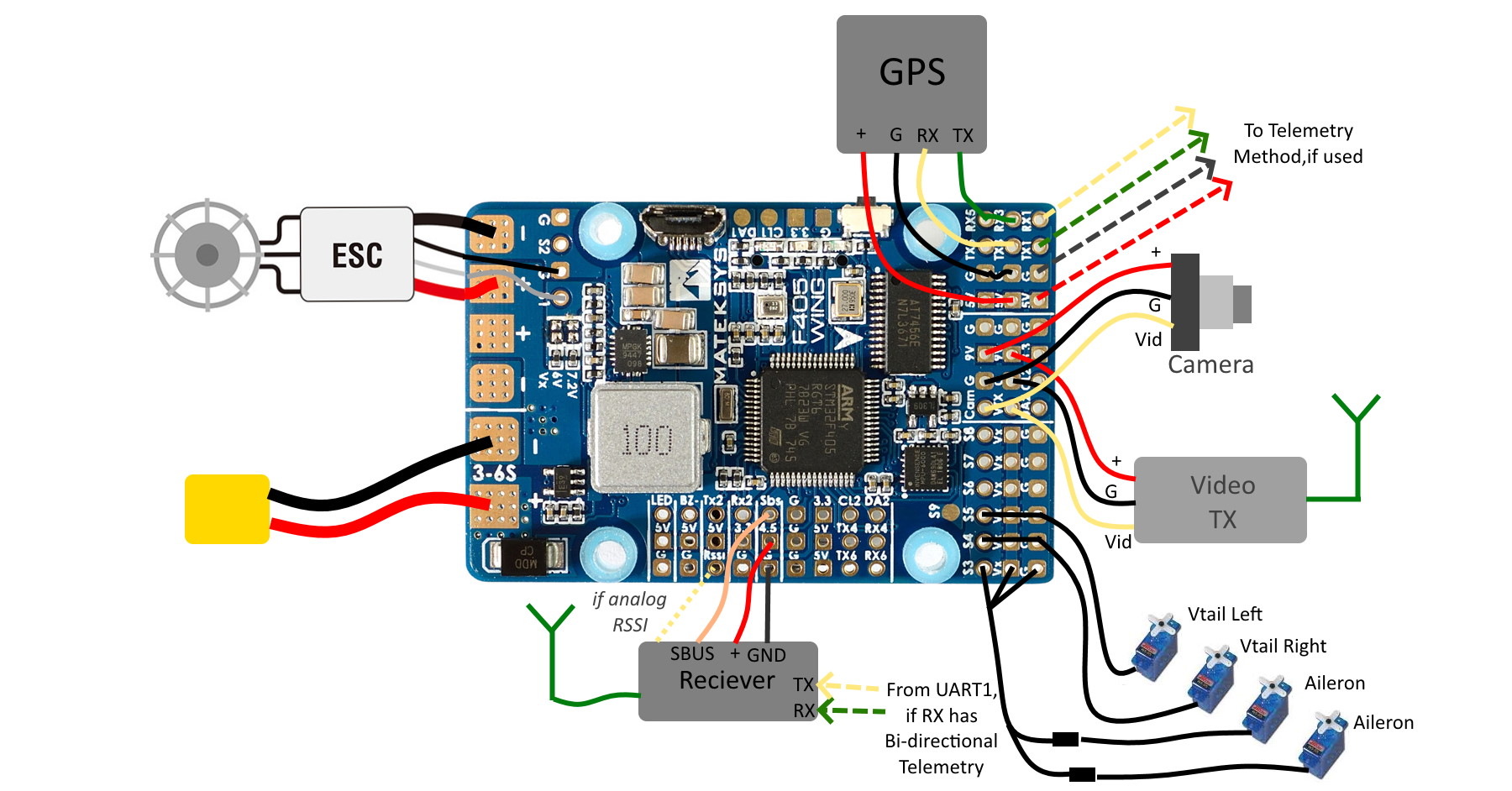 由于 MatekF405-Wing 集成了 OSD(屏幕显示)功能,因此无需外接 OSD。