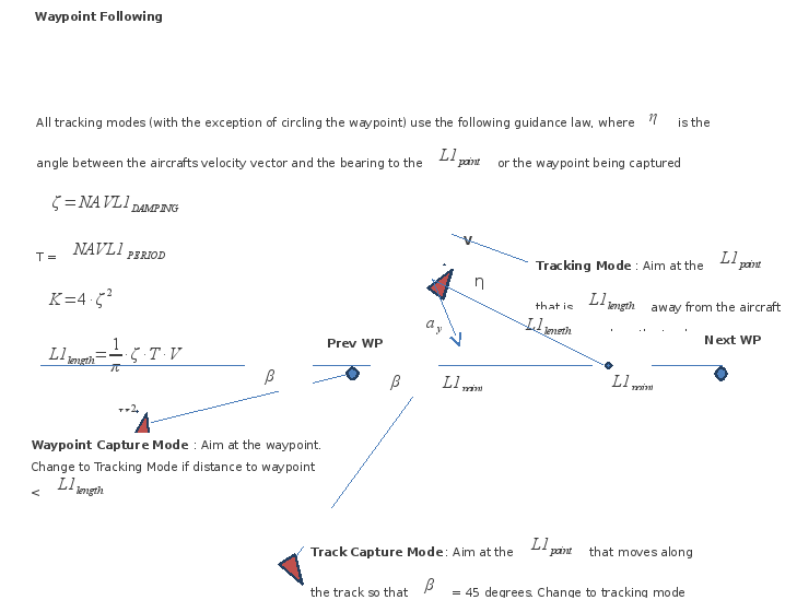 L1 长度是动态计算的,以便用户能够指定跟踪环路的恒定周期,并使导航环路增益能够根据飞机地面速度的变化自动调整。为制导环路设定一个恒定的周期,可在不同的空速下提供一致的响应,并使调整参数与滚动飞机和测量其响应所需的时间相关联。