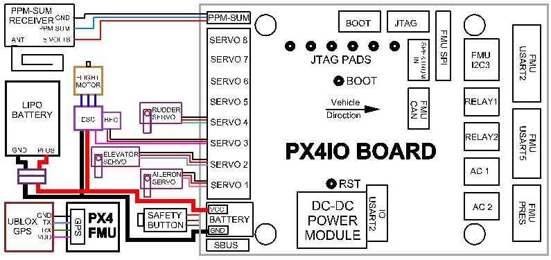 如果使用 PX4IO 电路板驱动大功率舵机,则需要单独提供舵机电源。